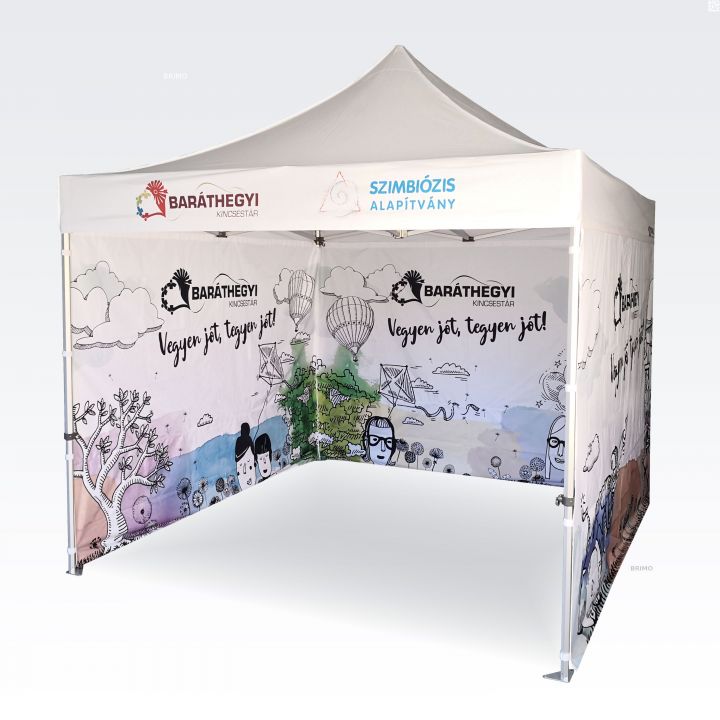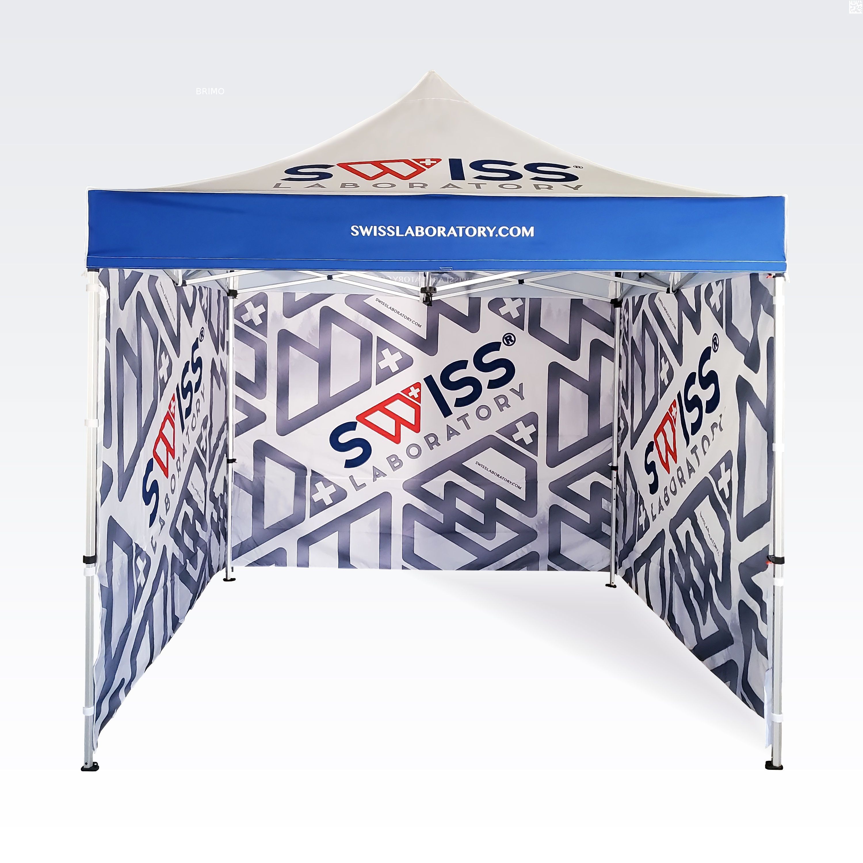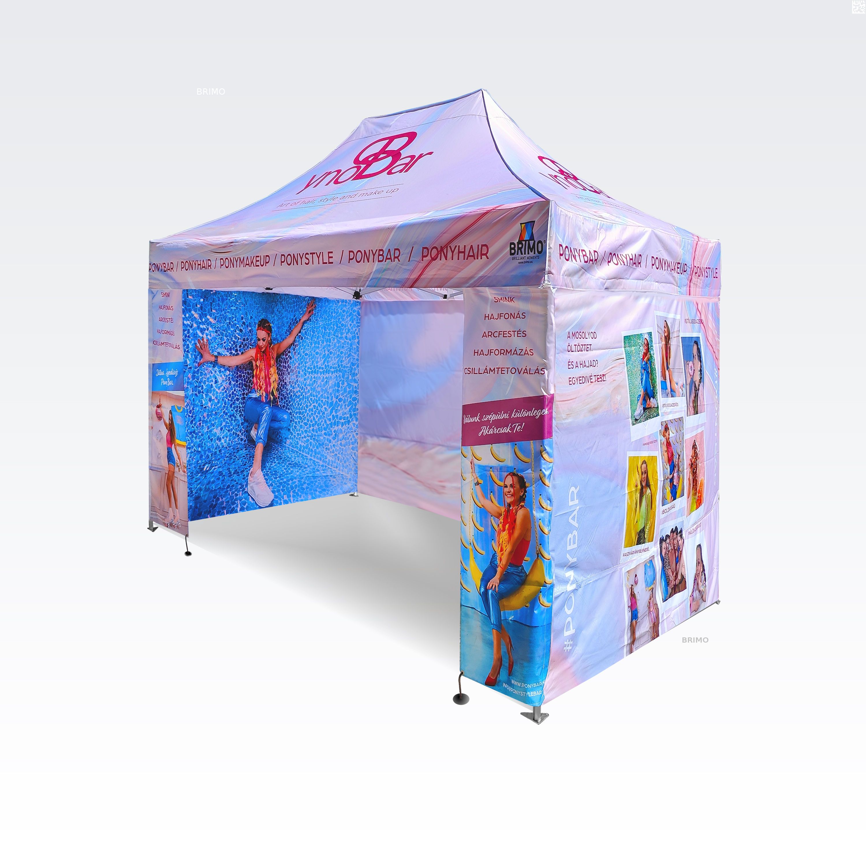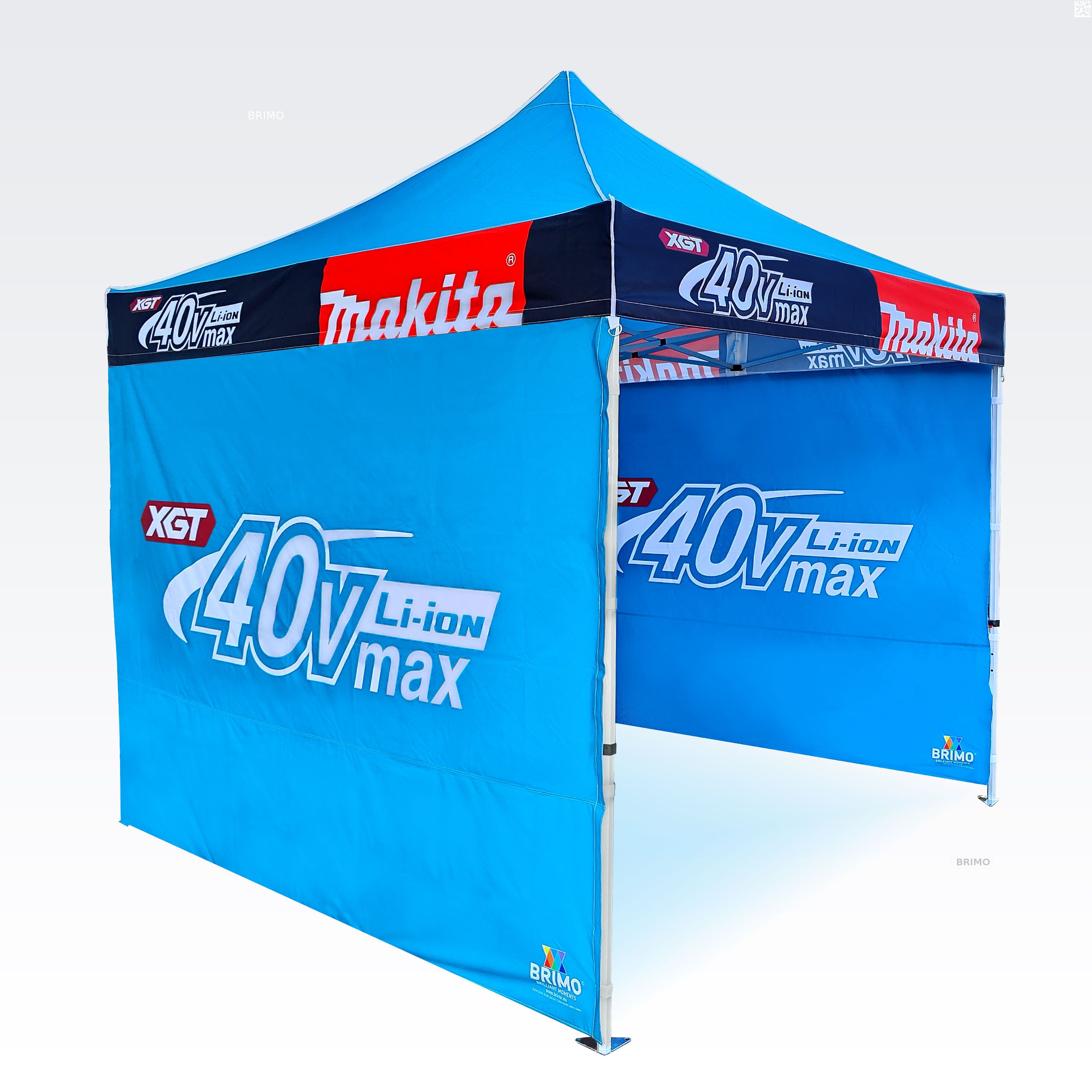 Tentes promotionnelles avec impression numérique par sublimation. L’impression est obtenue grâce à un processus chimique où l’encre, sous l’effet d’une température élevée, pénètre directement dans la structure du tissu. Logo, texte ou tout type de graphisme peuvent être imprimés à l’intérieur ou à l’extérieur de la tente selon les souhaits du client.