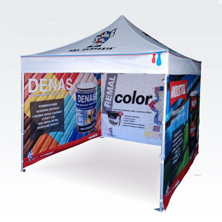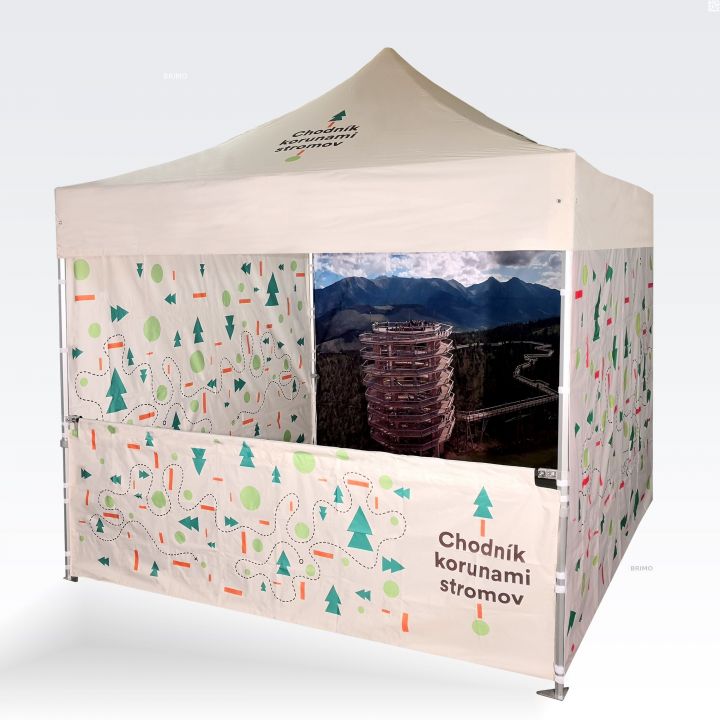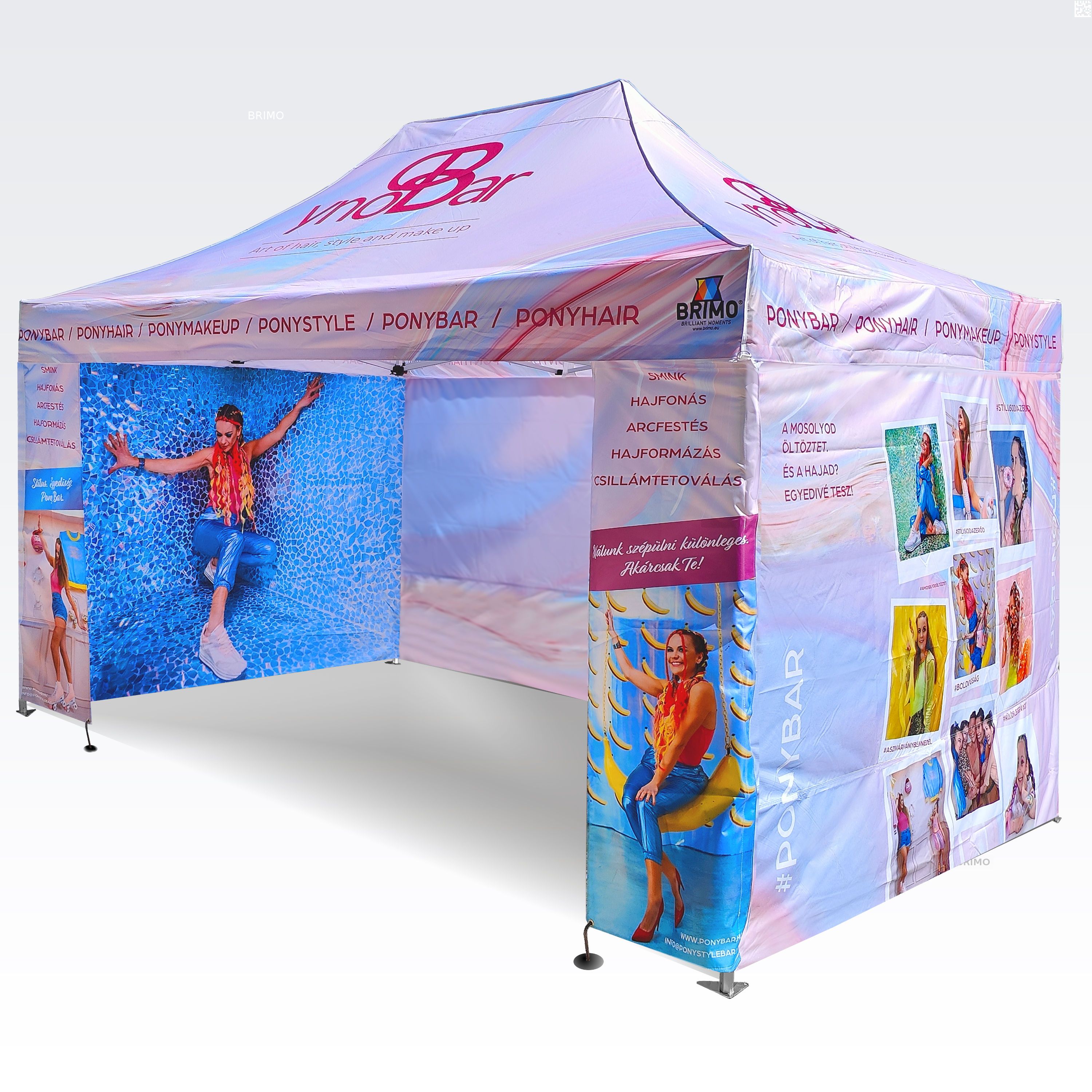 Les couleurs sont très vives et cette méthode reproduit parfaitement chaque détail sur les tentes publicitaires. Les couleurs éclatantes attirent le regard, et la sublimation garantit une longue durée d’utilisation sans perte de couleur. Avec cette méthode, quelle que soit la taille de l’impression, le prix reste le même (la taille de l’impression n’influence pas le prix des parois ou du toit). Plus l’impression est grande, plus la publicité est visible.