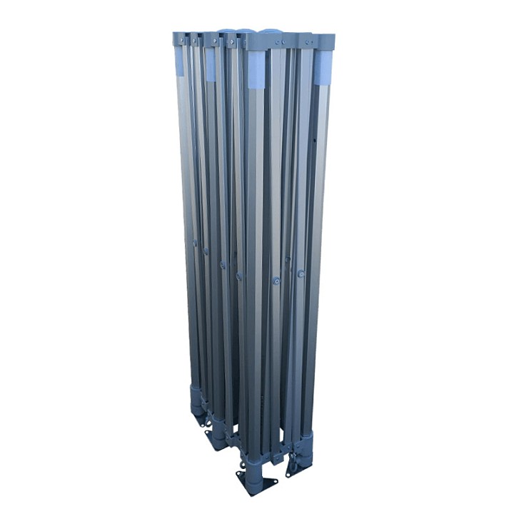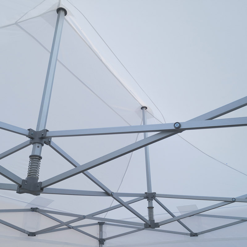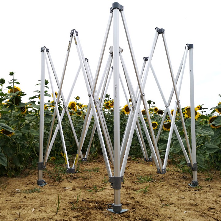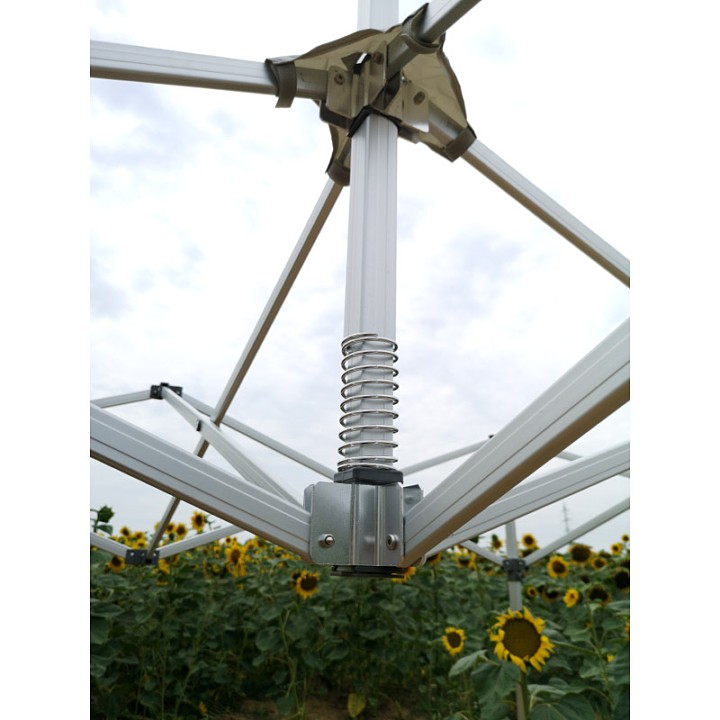 Le châssis de la tente est fabriqué en aluminium anodisé de haute qualité, qui ne s’oxyde pas, ne salit pas les mains (contrairement aux matériaux bon marché) et apporte une touche de luxe même dans les gros plans du photographe de mariage. L’élément clé est la grande proportion d’aluminium dans la structure, qui confère à l’ensemble la stabilité nécessaire. Cette solution technique augmente la capacité de charge et la résistance à la flexion, de sorte que la tente résiste facilement aux changements soudains de météo sans perturber l’atmosphère festive. Le montage s’effectue silencieusement, rapidement et sans aucun outil.