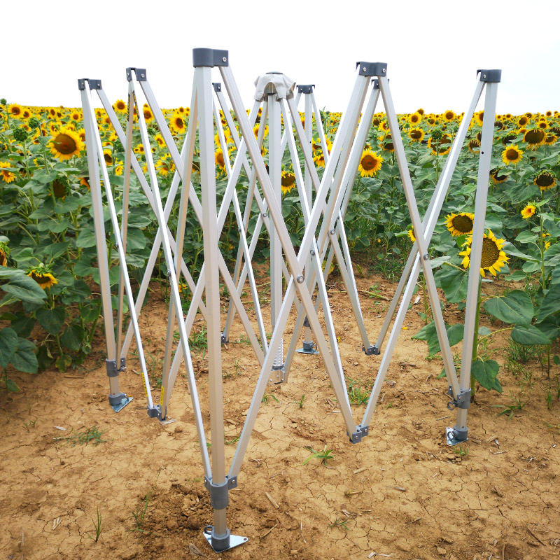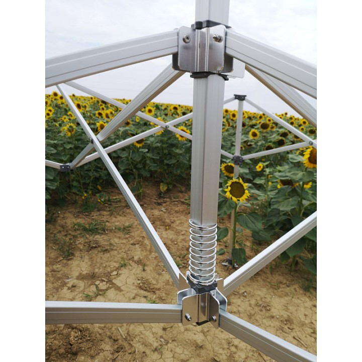 - Semelles larges des pieds : Des semelles en aluminium larges (10×15 cm) répartissent le poids de la tente, protégeant ainsi la pelouse des dommages.